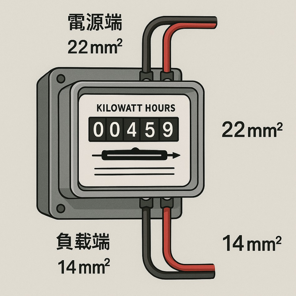 以下圖示說明住宅或商用電表接線方式,清楚標示電源端與負載端的導線線徑: